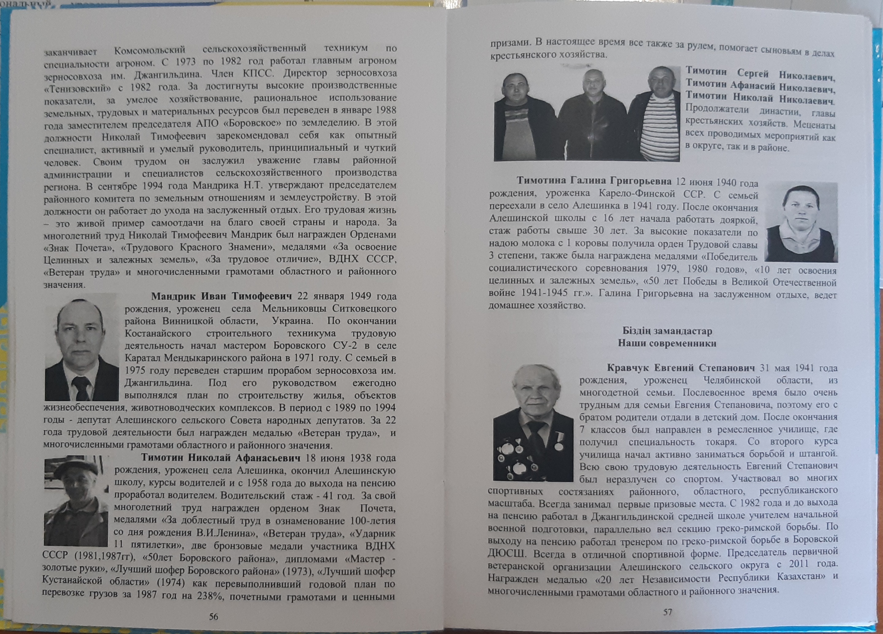 Алешин ауылдық кітапханасының кітапханашысы Г.В. Гульман Алешин ауылының тумасы, Меңдіқара ауданының Құрметті азаматы Николай Афанасьевич Тимотиннің 85 жылдығына орай «Я простого рода – родом из народа» атты ақпараттық құжаттама дайындады. Кітапханашы атақты жерлесімен жақынырақ танысуға, өзінің кіші Отанының тарихы туралы білуге 7 сынып оқушыларын шақырды. Балаларға балалық және жастық шағы, туып-өскен отбасы, Николай Афанасьевичтің еңбек қызметі туралы айтылды.