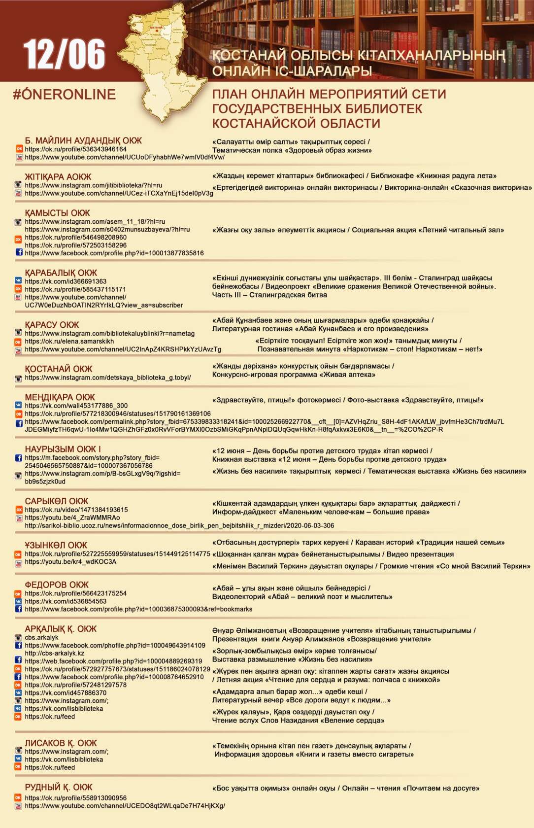Қостанай облысы кітапханаларының онлайн іс-шаралары 12/06