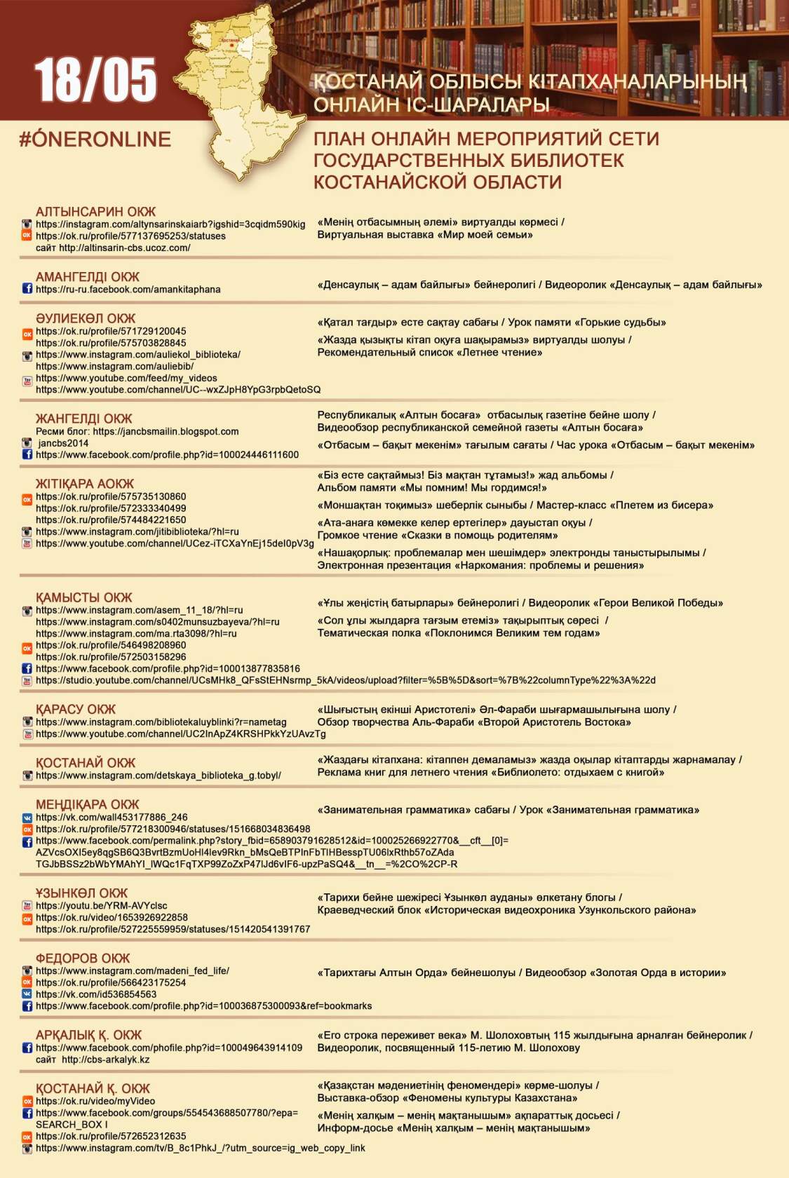 Қостанай облысы кітапханаларының онлайн іс-шаралары 18/05