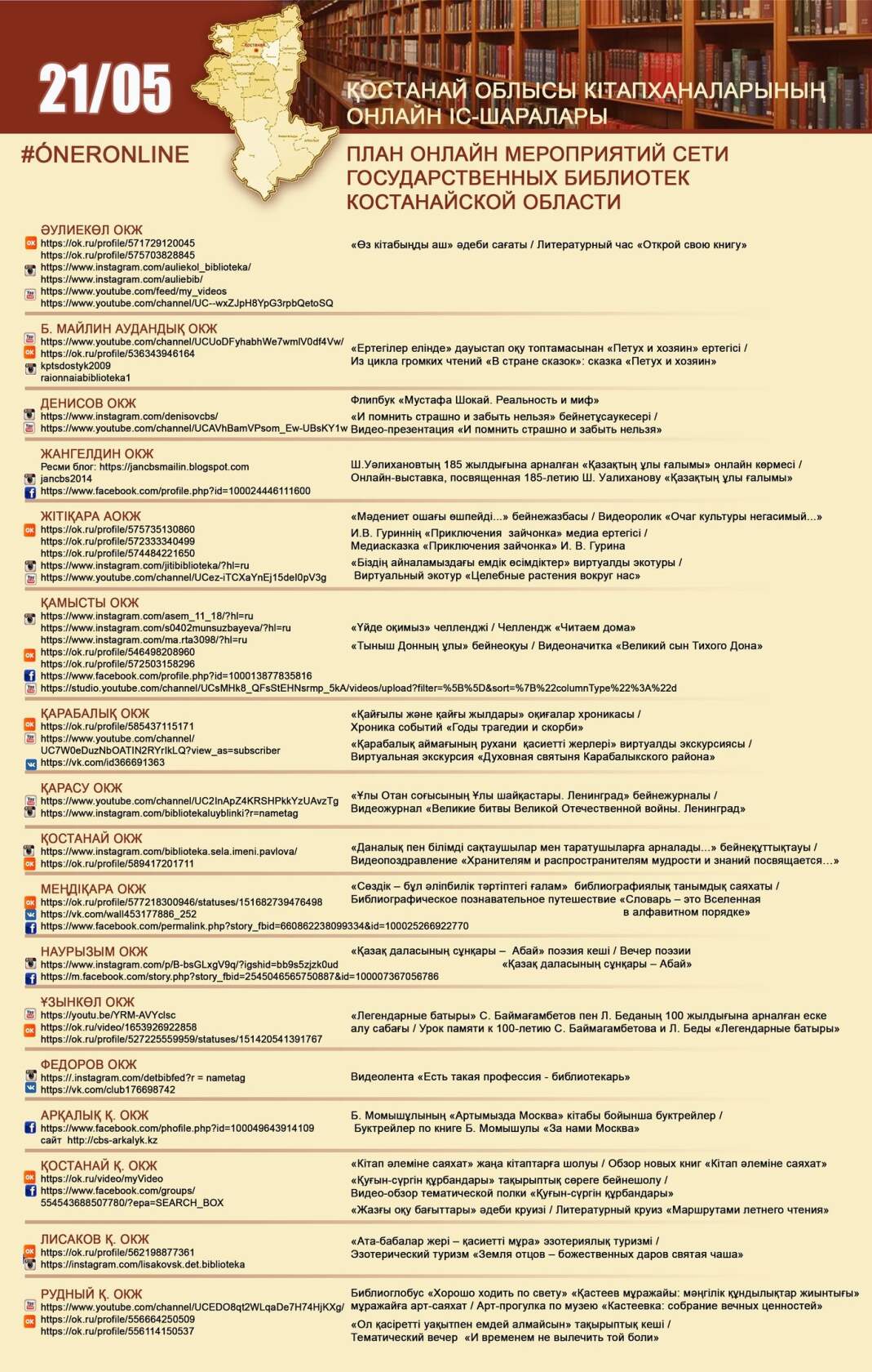 Қостанай облысы кітапханаларының онлайн іс-шаралары 21/05