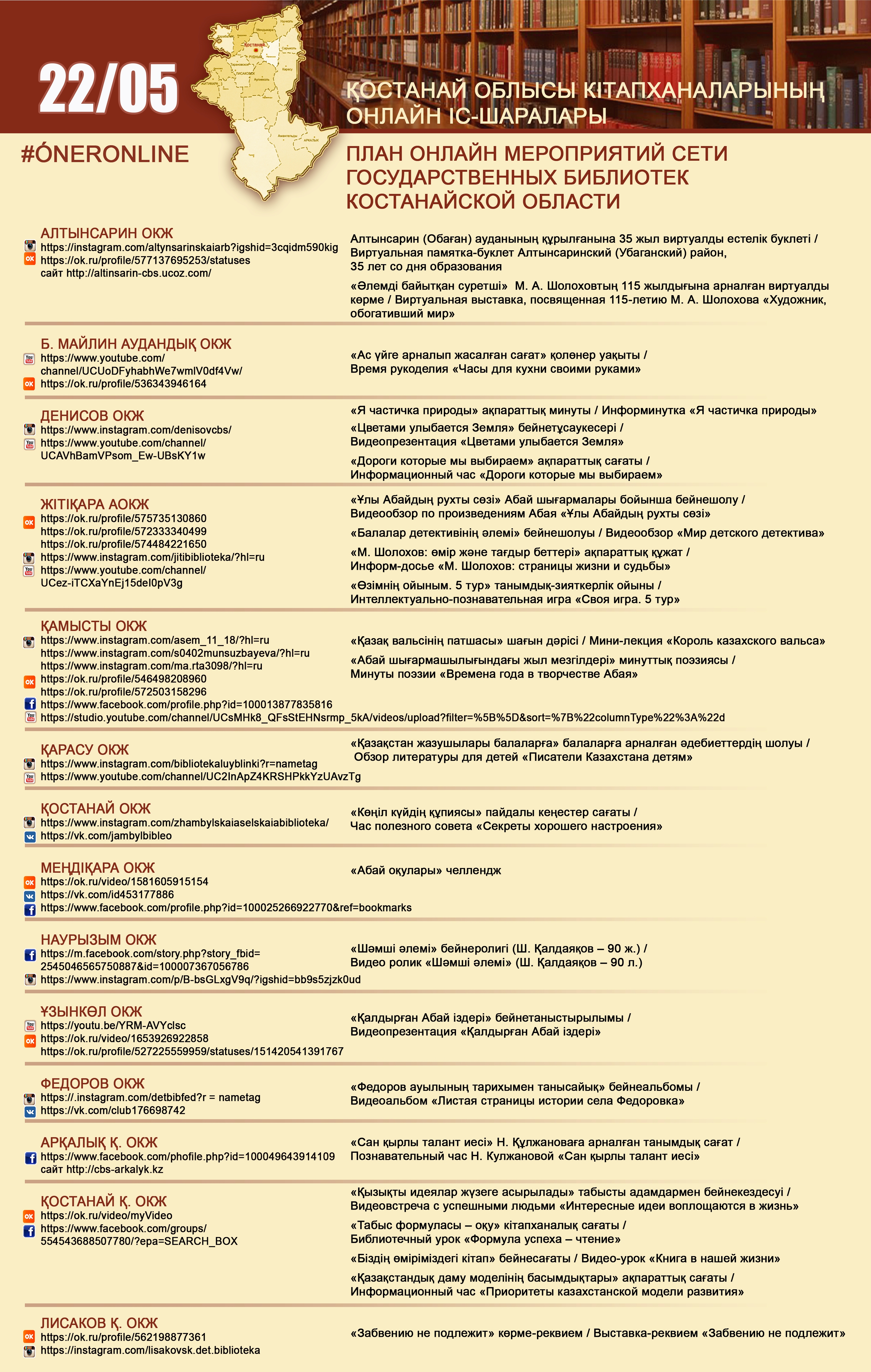Қостанай облысы кітапханаларының онлайн іс-шаралары 22/05