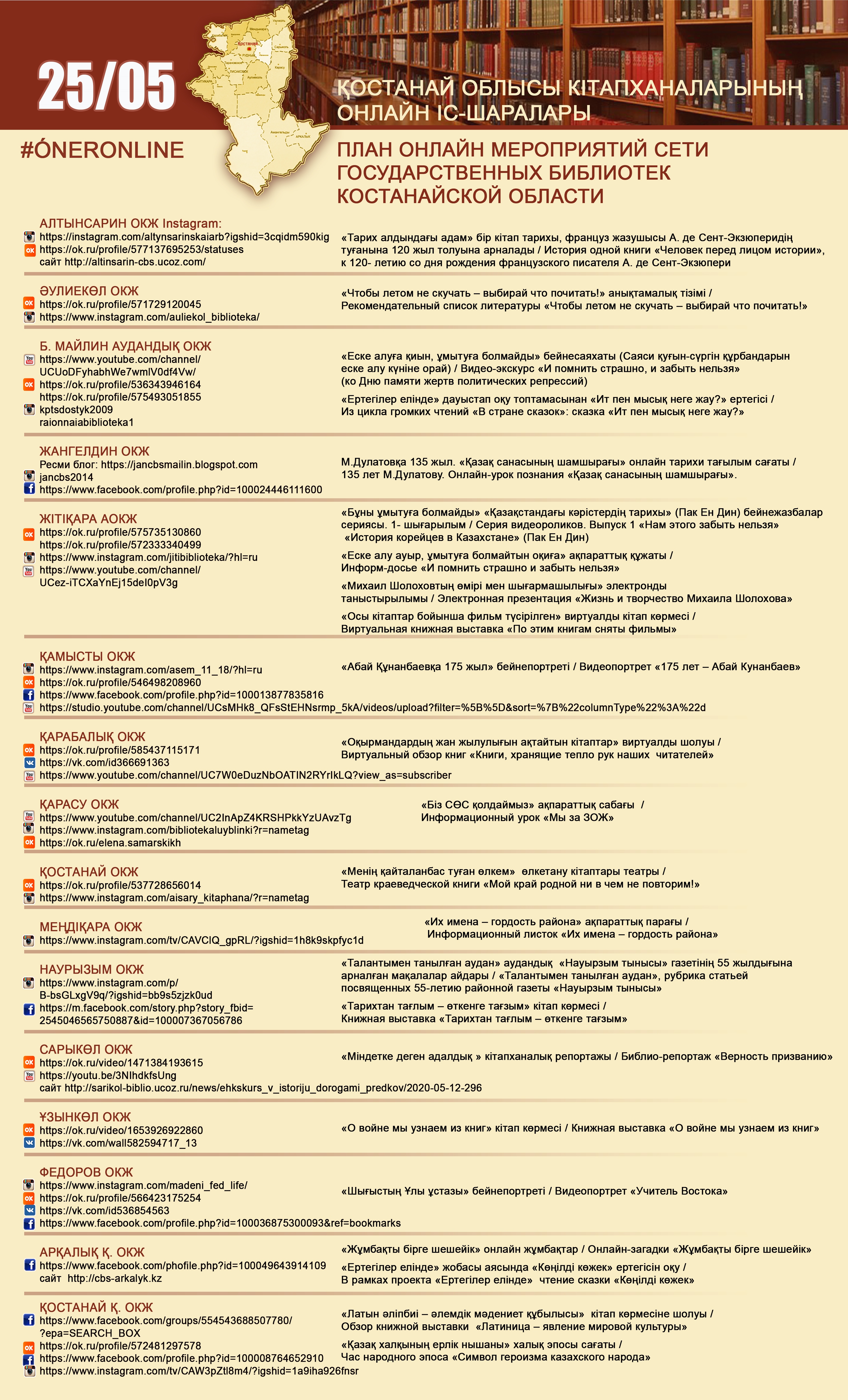 Қостанай облысы кітапханаларының онлайн іс-шаралары 25/05