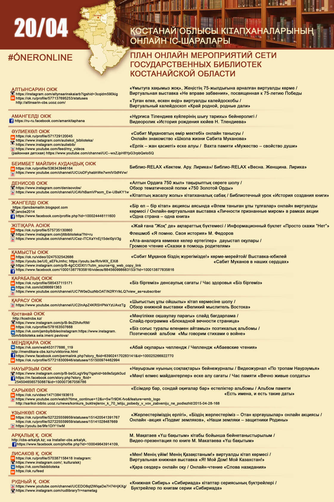Қостанай облысы кітапханаларының онлайн іс-шаралары 20/04