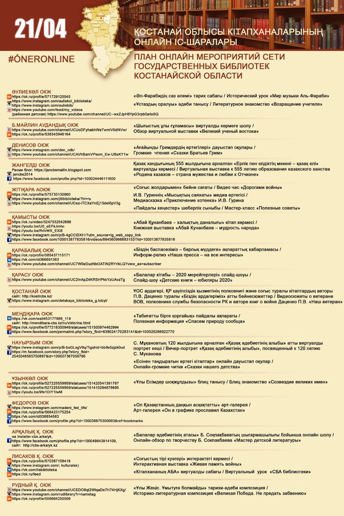 Қостанай облысы кітапханаларының онлайн іс-шаралары 21/04