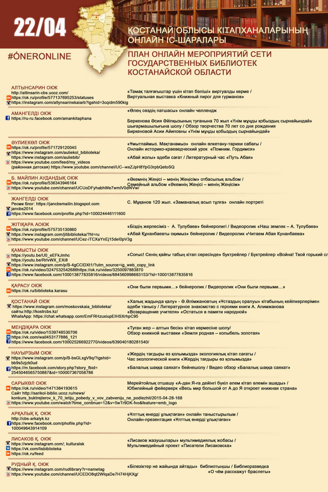 Қостанай облысы кітапханаларының онлайн іс-шаралары 22/04
