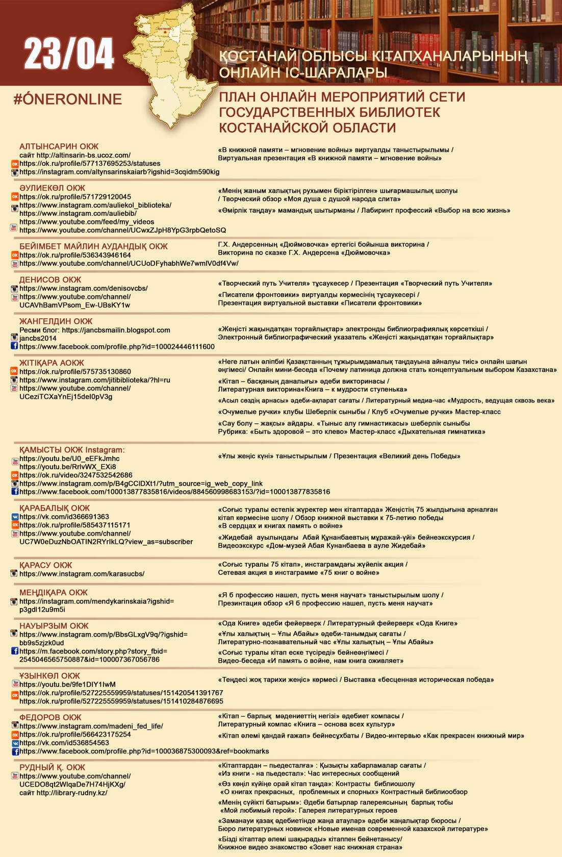 Қостанай облысы кітапханаларының онлайн іс-шаралары 23/04