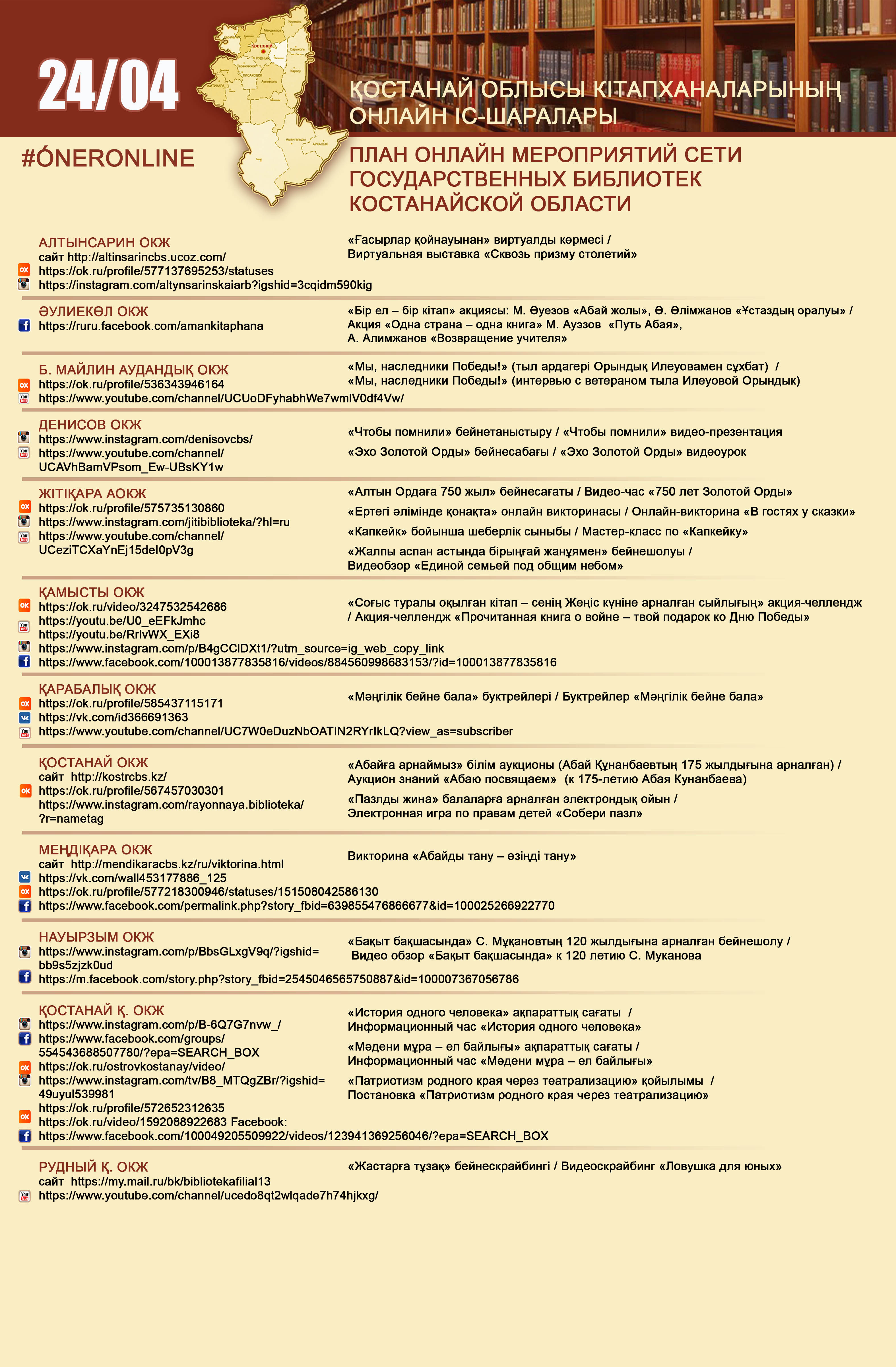 Қостанай облысы кітапханаларының онлайн іс-шаралары 24/04