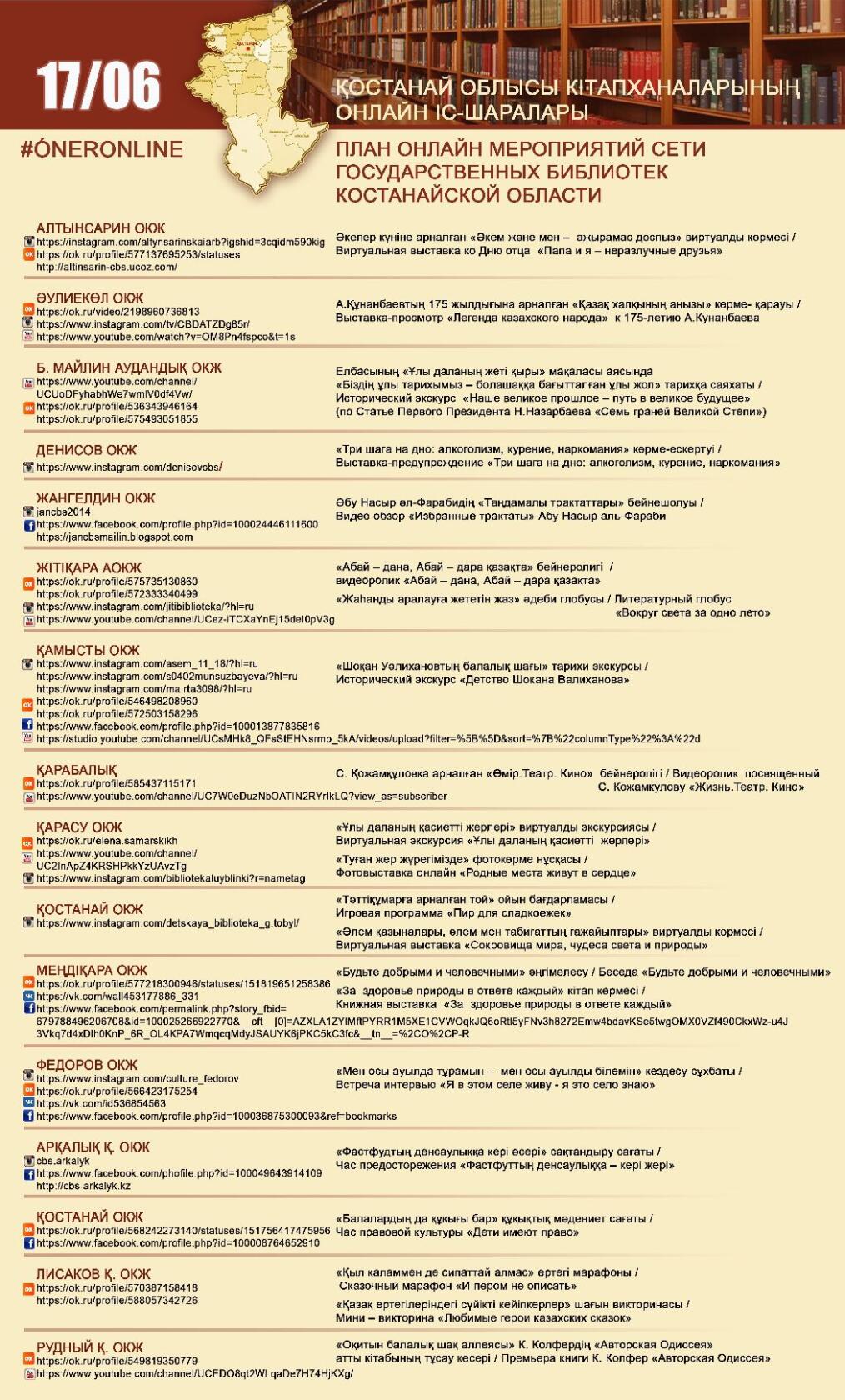 Қостанай облысы кітапханаларының онлайн іс-шаралары 17/06