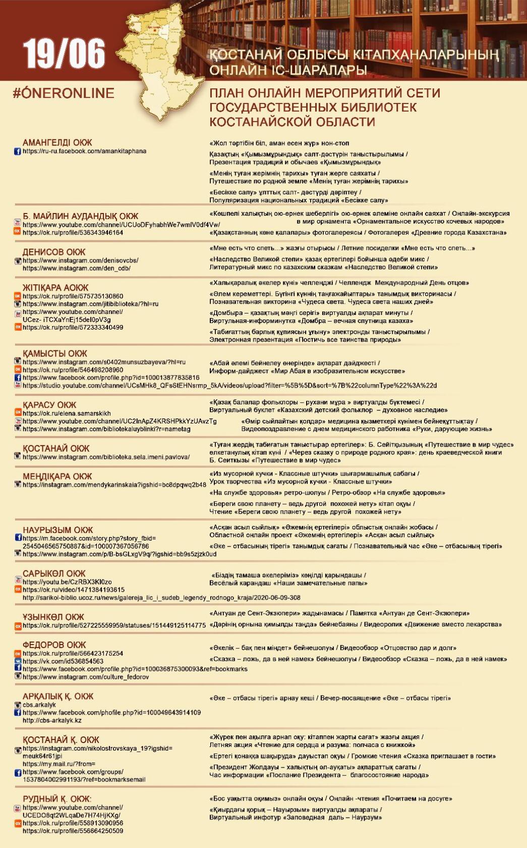 Қостанай облысы кітапханаларының онлайн іс-шаралары 19/06