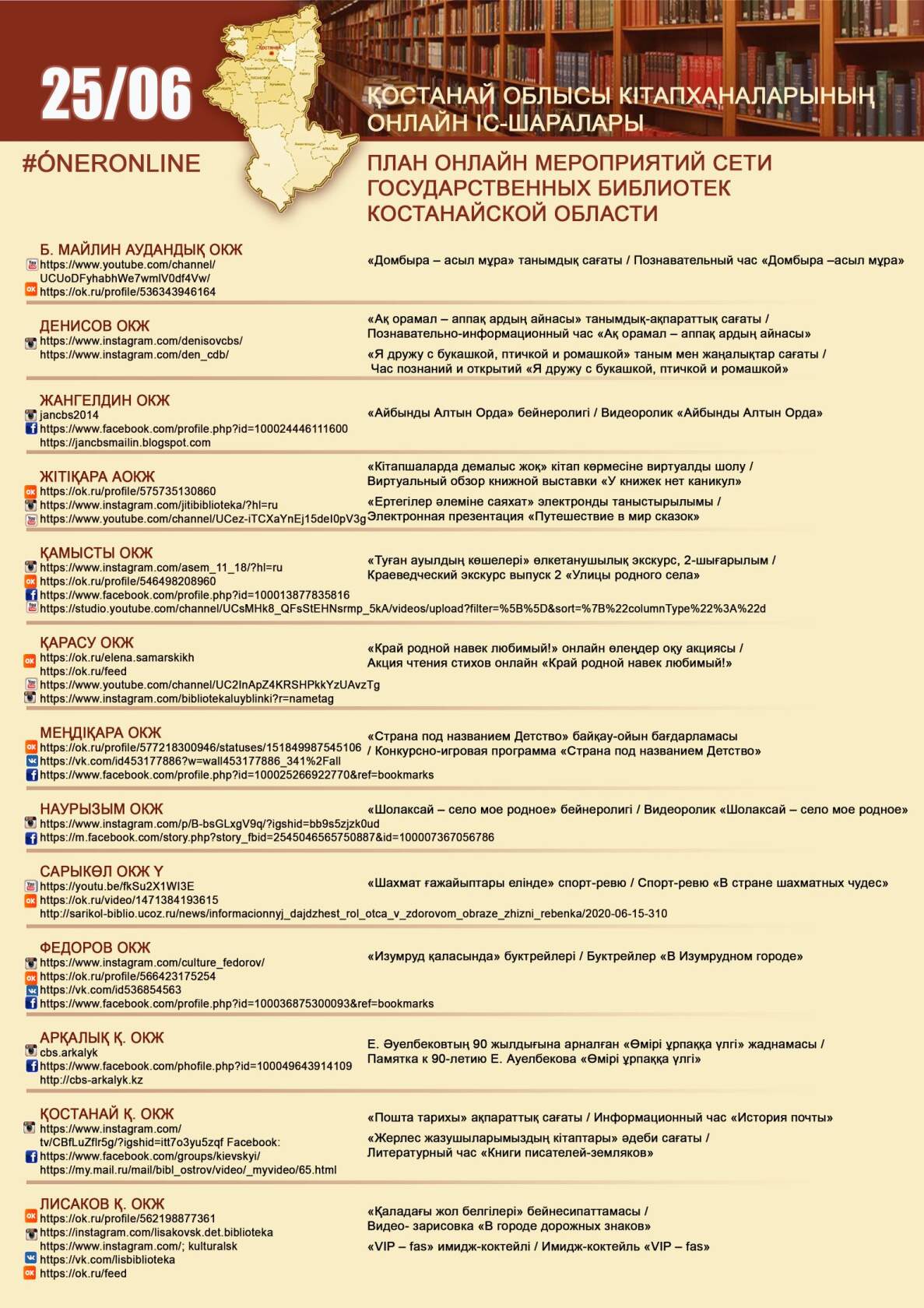 Қостанай облысы кітапханаларының онлайн іс-шаралары 25/06