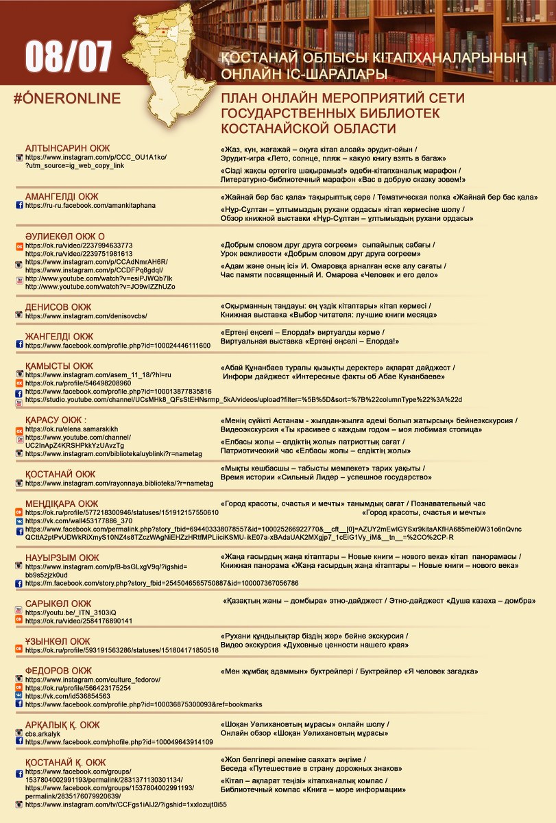 Қостанай облысы кітапханаларының онлайн іс-шаралары 08/07
