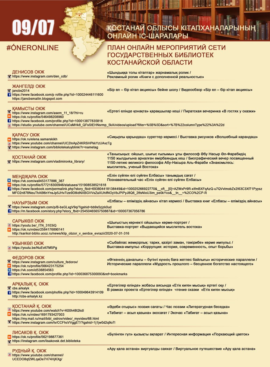 Қостанай облысы кітапханаларының онлайн іс-шаралары 09/07