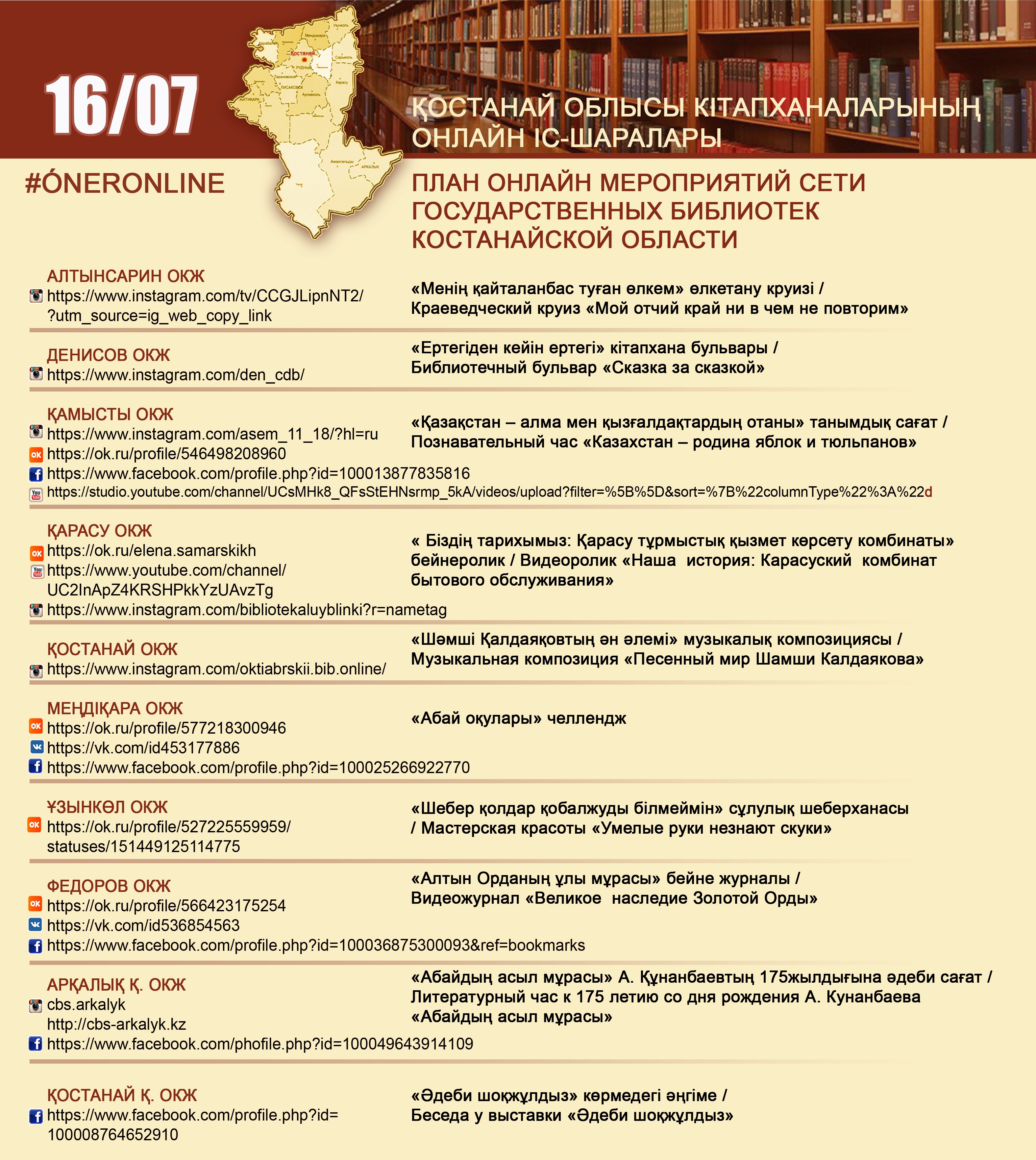 Қостанай облысы кітапханаларының онлайн іс-шаралары 16/07