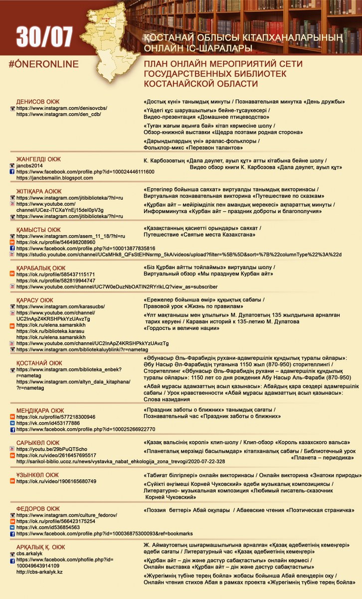 Қостанай облысы кітапханаларының онлайн іс-шаралары 30/07