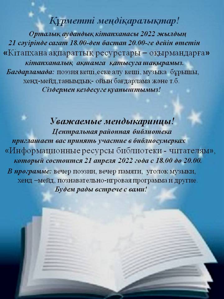 Уважаемые пользователи Центральной районной библиотеки! По уже сложившейся традиции мы вновь приглашаем Вас в центральную районную библиотеку познакомиться с новинками литературы! Представленные издания находятся в Отделе краеведения и литературы на казахском языке.