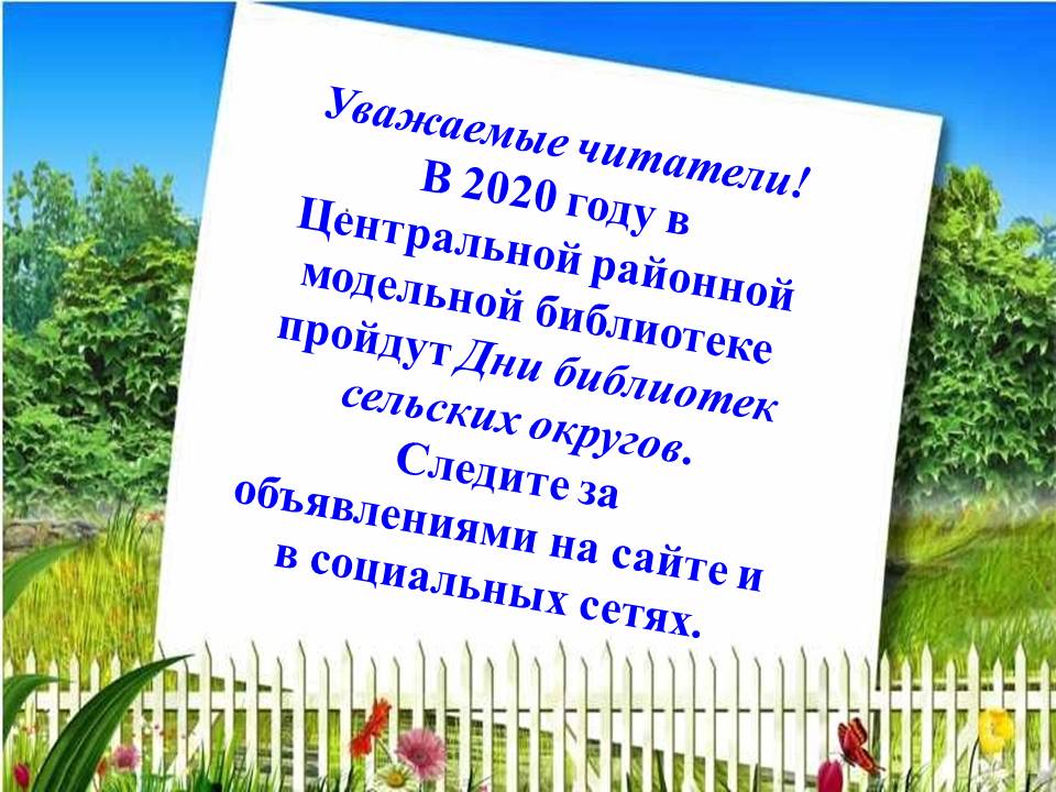 Центральная районная модельная библиотека обслуживает читателей на свежем воздухе два раза в неделю возле библиотеки во вторник и четверг часы работы с 9-30 до 12-00. При посещении библиотеки обязательно соблюдение санитарных требований: иметь маску, перчатки и соблюдать дистанцию 1,5 метра.