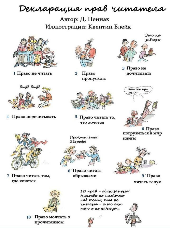 - «Хорошо поставленное чтение спасает нас от всего, в том числе от самих себя… А если более буднично, то книга – убежище.» «Парадокс чтения: оно уводит нас от реальности, что бы наполнить реальность смыслом» Пеннак Д.