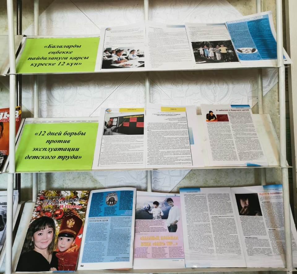 "Бала еңбегін пайдалануға қарсы 12 күн " акциясы аясында Жангелді ауылдық кітапханасында 2020 жылдың 9 маусымында кітапханашы Р. М. Арыстанова "Балалық шақтың бал дәурені" атты көрмеге шолу жасады, іс шара барысында кітапханашы балаларға тақырыпқа сай мәлеметтер берді, қатысушылар тақпақ айтып, суреттер салды. Балалар белсенді қатысты. 18 адам қатысты.