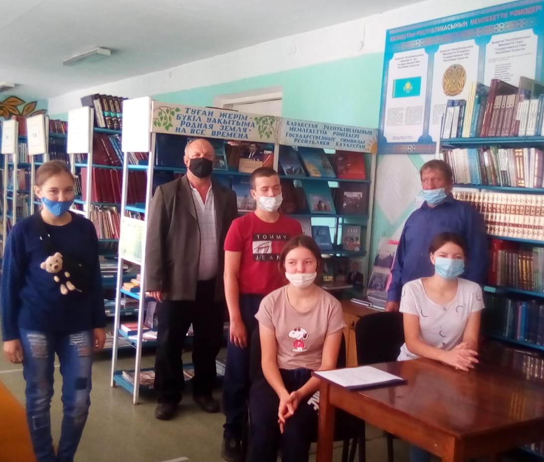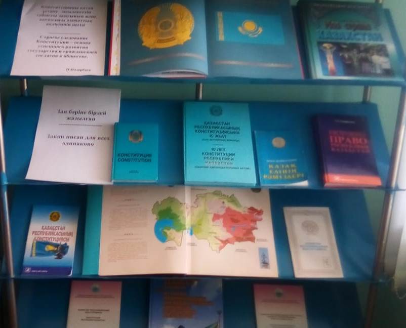 К мероприятию была оформлена книжная выставка «Зан бәріне бірдей жазылған. Закон писан для всех одинаково». Библиотекарь ребятам провела обзор книжной выставки. Также рассказала о самом важном государственном празднике – Дне Конституции Республики Казахстан, дети получили много полезной и важной информации о своих правах и обязанностях. В конце мероприятия работники ДК «Меридиан» Клинг И.Я. и Шабунько А.Ф. провели викторину «Знаете ли вы историю своей Родины». Присутствовало 9 человек.