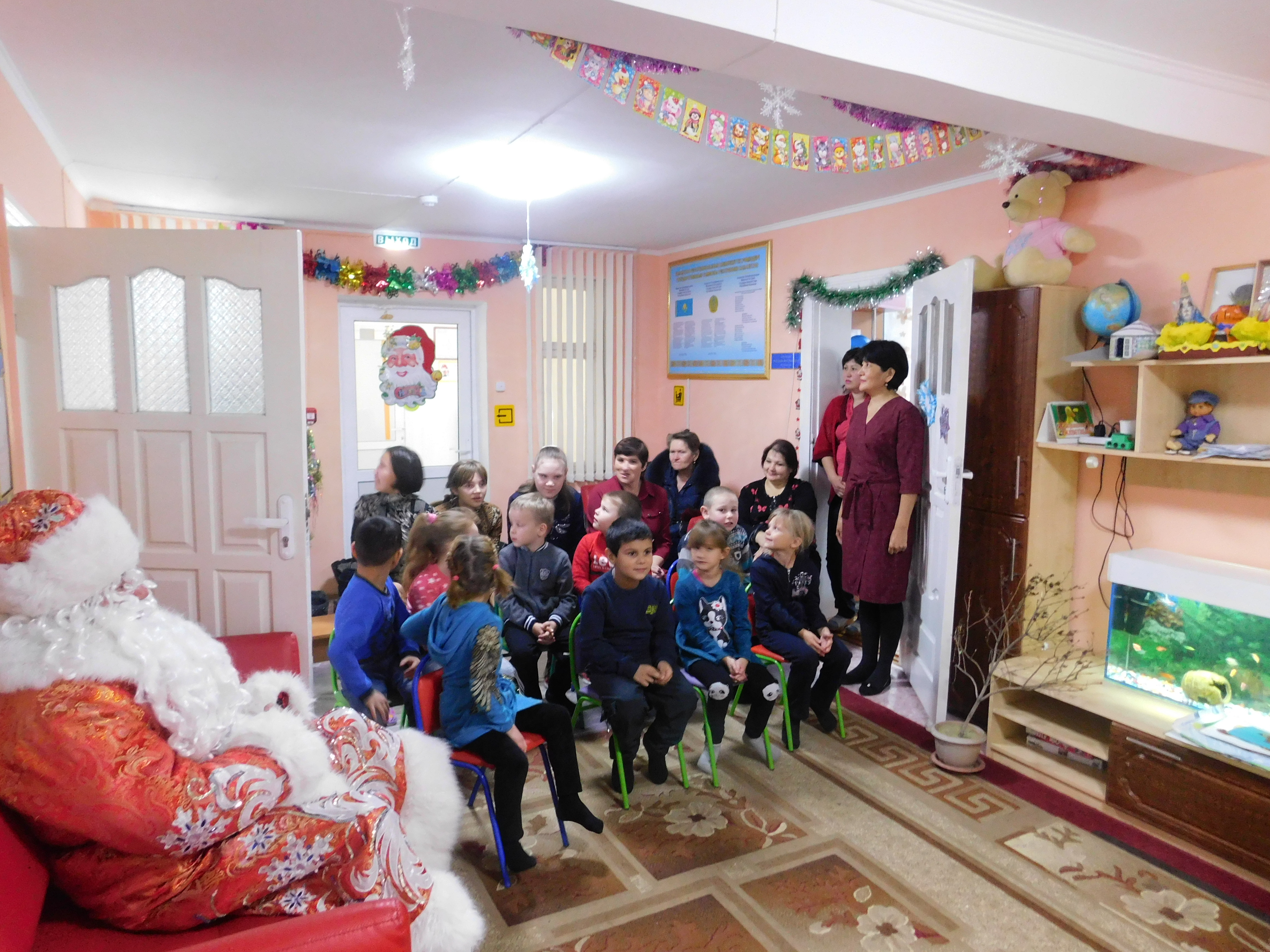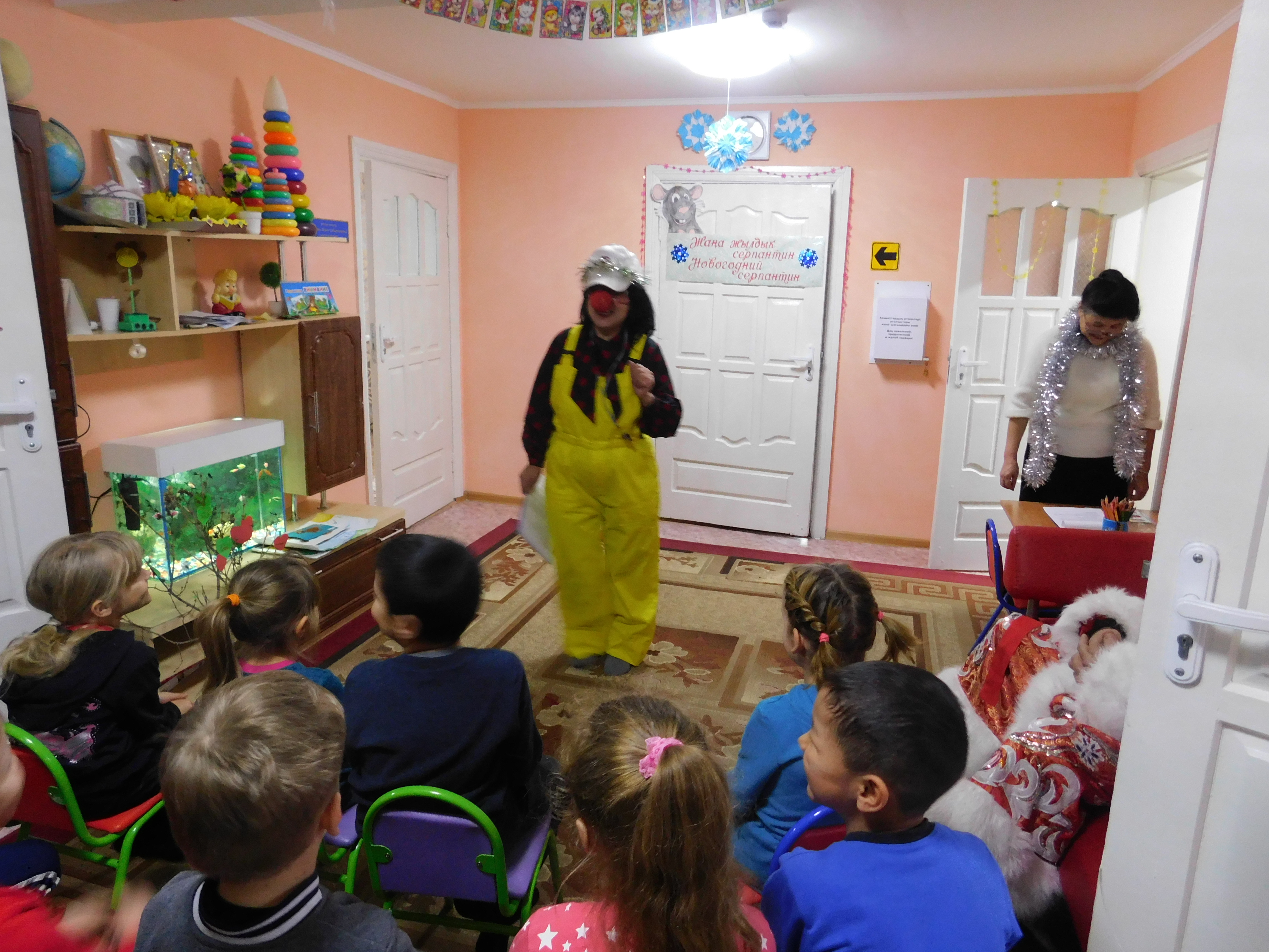 провели с детьми игры: «Заверши предложение», «Кричалка», «Ежики», «Собери снежки», «Любит Снегурочка», «Елочный компот» и различные викторины. Ребята написали на листочках в виде лепесточков и яблок свои заветные желания и прикрепили на «дерево желаний», чтобы желания сбылись в наступающем Новом году. К детям пришли в гости Дед Мороз с подарками (специалист РДК «Юбилейный» Г..Т. Маутанов) и Клоун Кирюшка (Ибраева Р.С.). Дети читали стихи, пели песни, а Дед Мороз подарил им книжки и сладкие призы (плитки шоколода, конфеты).