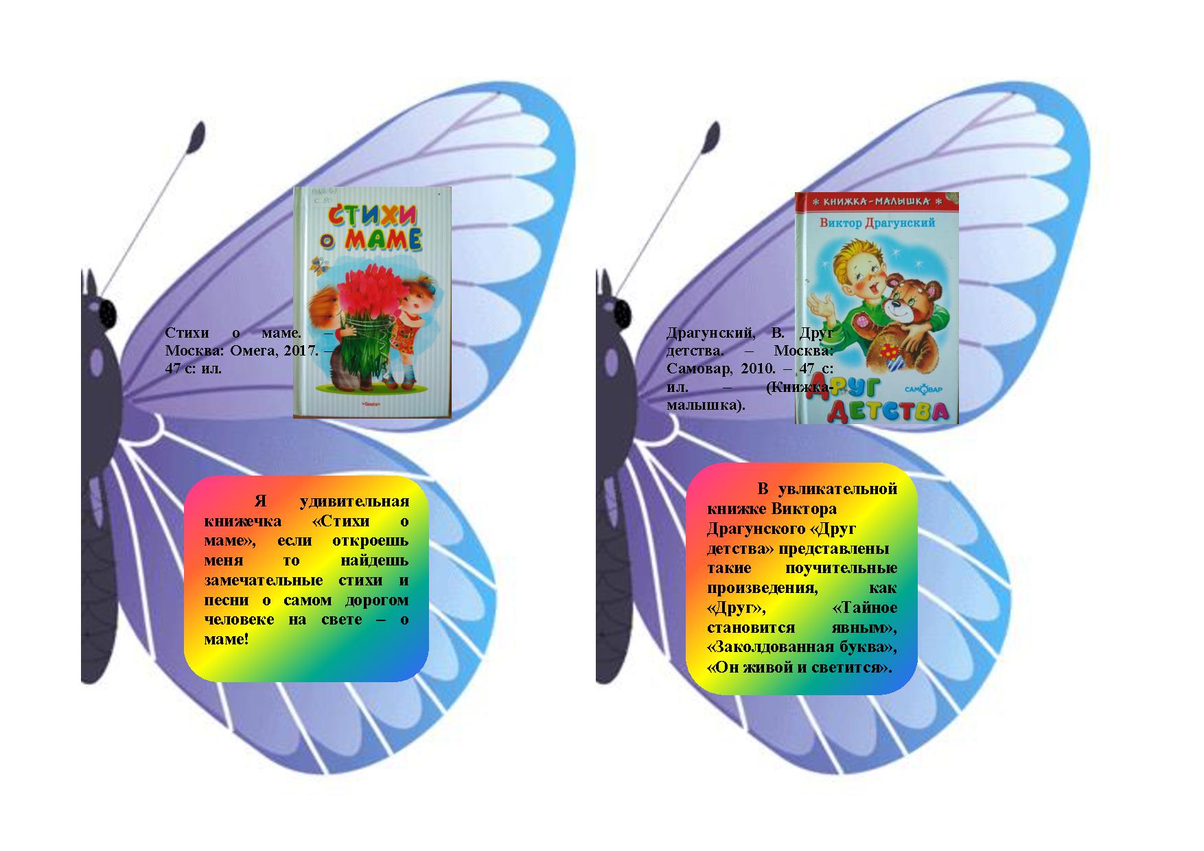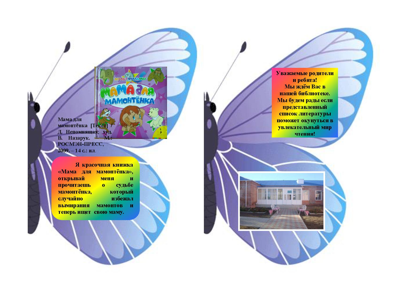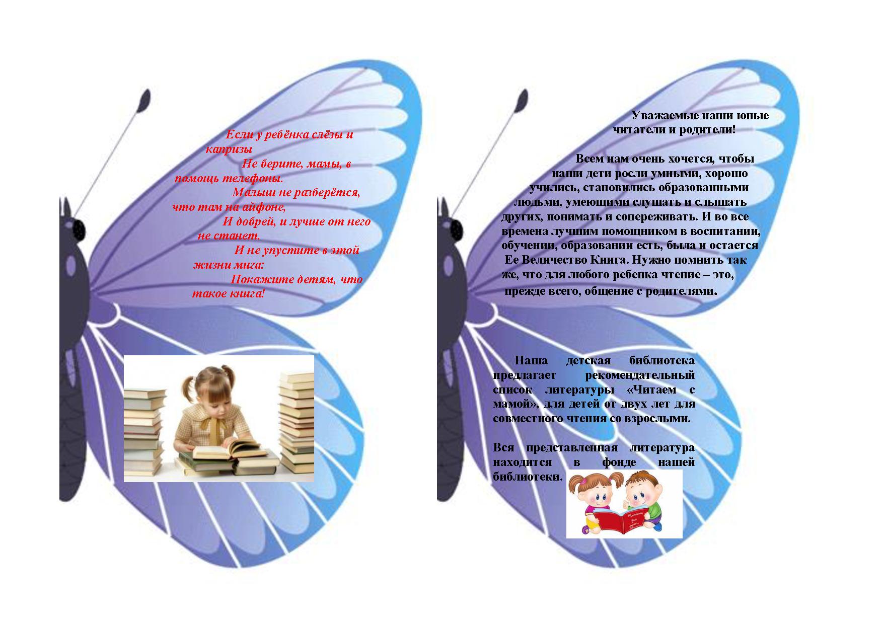 Мендыкаринская центральная модельная библиотека представляет рекомендательный список литературы «Читаем с мамой» в виде красочной бабочки для лучшего привлечения юных читателей и их родителей к прочтению рекомендуемых книг.